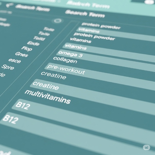 Zoomed-in view of backend search term input screen, filled with supplement-related keywords. Light, tech-style layout with subtle, modern shades.
